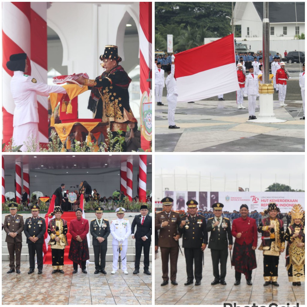 Pj. Gubernur Sumut Agus Fatoni saat pimpin perayaan HUT Kemerdekaan RI ke-79, di Lapangan Astaka, Deliserdang, Sumut, Sabtu (17/8/2024).