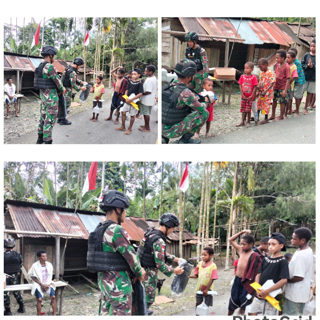 Keerom - Dalam rangka kegiatan Hari Kemerdekaan Republik Indonesia RI Ke-79 dan sebagai wujud solidaritas TNI dalam melaksanakan tugas di bumi Cendrawasih kepada masyarakat perbatasan, Pos Kalilapar Satgas Yonif 122/TS mengulurkan tangan memberikan bantuan makanan, tas sekolah dan alat tulis kepada masyarakat dan anak anak sekolah di Kabupaten Keerom, Distrik Waris, Papua, Senin (19/08/2024).