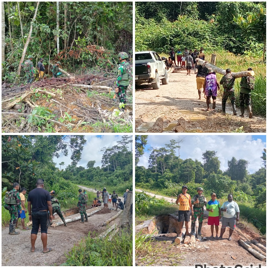 Teluk Bintuni - Satgas Pamtas RI-PNG Kewilayahan Papua Barat Yonif 642/Kps Pos Meyerga Kampung Meyerga, Kecamatan Moskona Barat, Kabupaten Teluk Bintuni, Provinsi Papua Barat ikut serta memperbaiki jembatan yang roboh akibat longsor yang mengakibatkan terputusnya jalur perlintasan warga Meyerga, Senin, (19/08/2024).