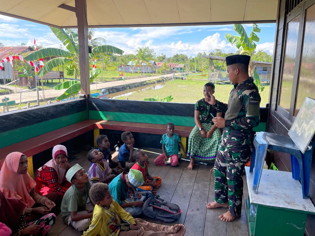 Satgas Yonif 642/Kps Bangun Tiang Agama Melalui Belajar Mengaji Bersama Anak-Anak Selasa, 20/08/2024 | 08:35