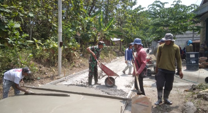 Kerja bakti Babinsa dan warga untuk pengecoran jalan.