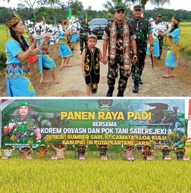 Danrem 091/ASN menyampaikan di mana hari ini kita bersama pemerintah daerah dan Kodim 0906/Kkr beserta kelompok Tani Sari Rejeki Desa Sumber Sari melakukan panen raya dimana panen raya yang kita lakukan ini adalah sinergitas antara pemerintah daerah, kemudian Kodim Kukar beserta kelompok tani di mana pemerintah dan Kodim melakukan pendampingan untuk memotivasi para kelompok tani untuk meningkatkan hasil pertanian dan ini terbukti pada pagi hari ini dimana penyuluh menjelaskan panen kali ini di lahan sekitar 15,5 hektar dimana dalam satu Hektar dapat menghasilkan 5 hingga 6 ton gabah tuturnya .
