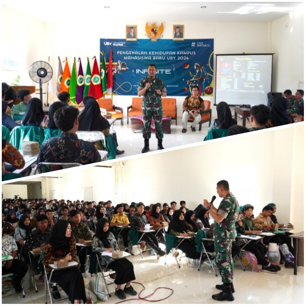 Boyolali - Komandan Kodim 0724/Boyolali Letkol Inf Wiweko Wulang Widodo, S.Pd.M.Han. memberikan materi Bela Negara kepada mahasiswa di Universitas Boyolali juga tentang kemajuan teknologi dan informasi global yang menjadi tantangan besar bagi generasi muda, Jumat Sore (06/09/2024).