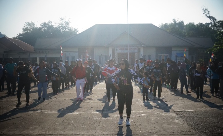 Kapuas Hulu - Dalam pagi yang cerah, wujudkan hidup sehat dan bugar, Satgas Pamtas RI-Malaysia Yonzipur 5/ABW melaksanakan senam bersama berbaur dengan seluruh lapisan masyarakat, dari anak sekolah dasar sampai SMA sederajat, instansi perkantoran, puskesmas, dan warga yang di laksanakan di lapangan kantor Kecamatan Badau, Kapuas Hulu, Sabtu (07/9/2024).