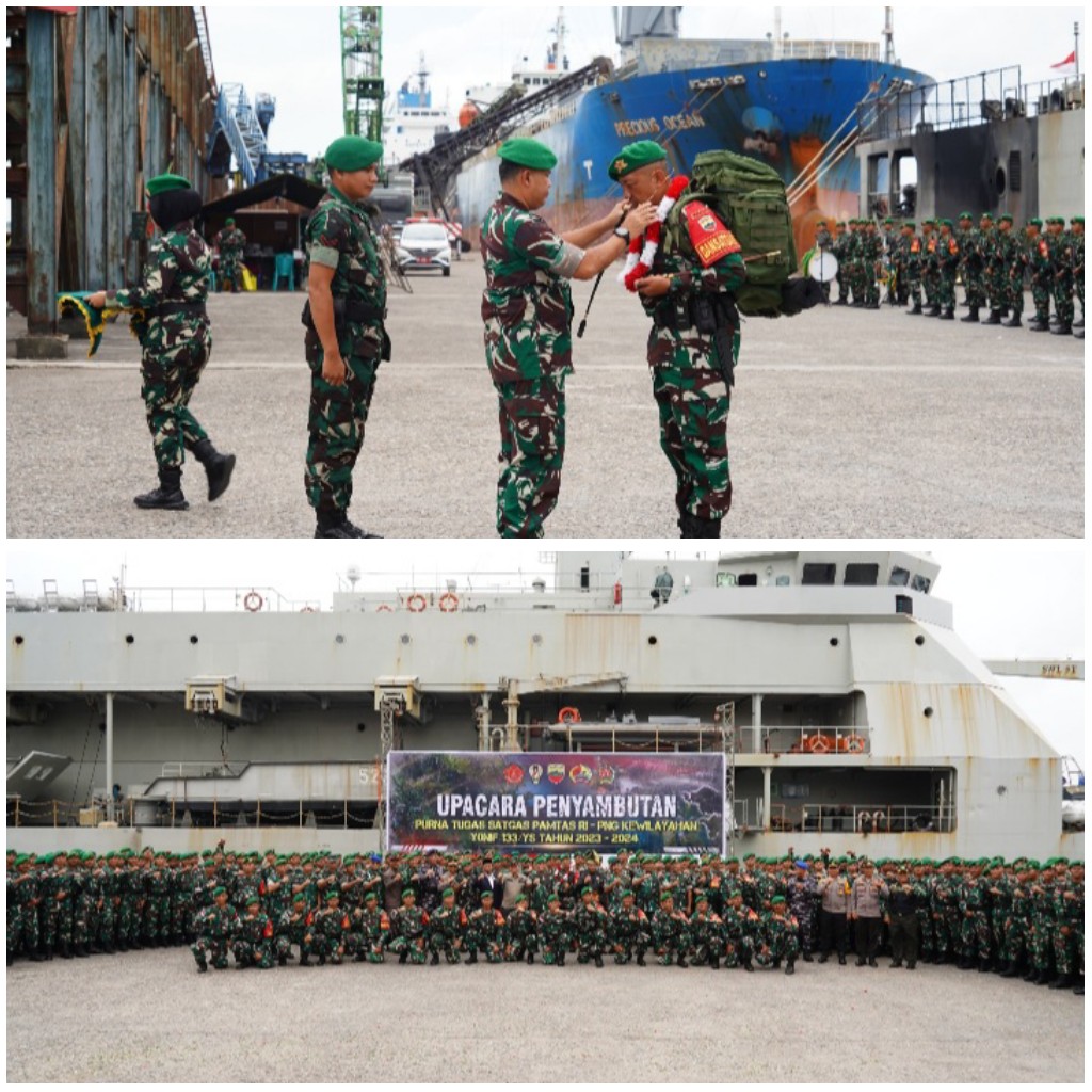 Dumai - Ratusan prajurit Yonif 133 Yudha Sakti tiba di pelabuhan Dumai usai sukses melaksanakan satgas Pamtas RI PNG 2023. Kedatangan ratusan prajurit ini disambut langsung oleh Komandan Korem (Danrem) 032/Wira Braja Brigadir Jenderal TNI Wahyu Eko Purnomo, S.I.P di Pelabuhan pelindo Kota Dumai pada Minggu (15/9) menggunakan KRI Teluk Palu-523 yang bersandar pada pukul 11.00 WIB.