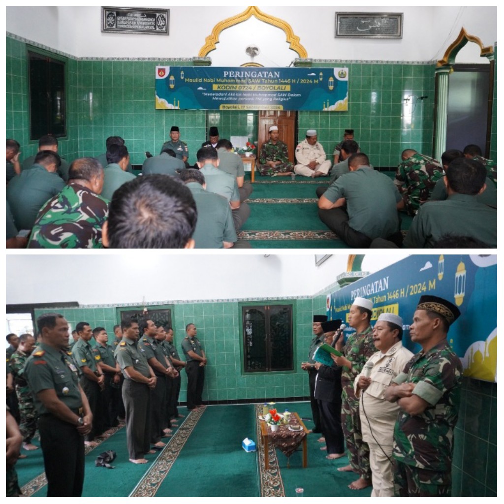 Boyolali - Kodim 0724/Boyolali menyelenggarakan acara peringatan Maulid yang bertempat di Masjid Baitul Rahman Makodim Boyolali Jl. Padanaran Desa Tegalmulyo Kecamatan Mojosongo Kabupaten Boyolali, Selasa (17/09/2024).