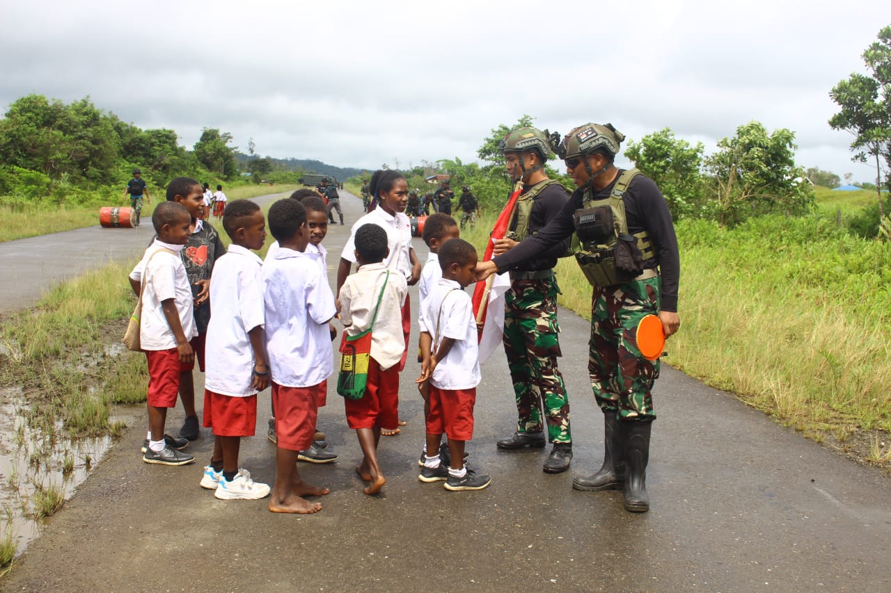 Kenyam Nduga - Satuan Tugas Batalyon Infanteri (Satgas Yonif) Para Raider 503/Mayangkara Kostrad, sebagai salah satu Satuan Jajaran Komando Operasi HABEMA di Papua, tengah melaksanakan tugas Operasi Pengamanan Perbatasan Mobil RI-PNG, khususnya di wilayah Kabupaten Nduga, Provinsi Papua Pegunungan. Pada hari Senin, 16 September 2024, Satgas Yonif 503 Kostrad, khususnya Pos Kotis Kenyam pimpinan Letkol Inf Gurbasa Samosir, melaksanakan Komunikasi Sosial (Komsos) dengan anak-anak sekolah warga Kampung Sralala, Distrik Kenyam, sambil melaksanakan pengamanan wilayah.