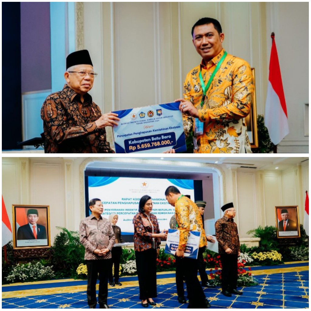 Batu Bara - Di sela rapat koordinasi percepatan penghapusan kemiskinan ekstrem tahun 2024, Pemerintah Kabupaten Batu Bara menerima secara simbolis dana Insentif Fiskal kategori daerah berkinerja baik dalam percepatan penghapusan kemiskinan ekstrem tahun 2024, yang diterima oleh Pj. Bupati Batu Bara Heri Wahyudi dan didampingi Kepala Bappelitbangda Arif Hanafiah di auditorium sekretariat wakil presiden, Jakarta pusat (18/09/24).