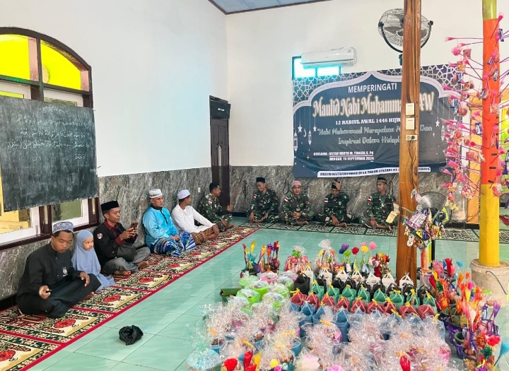 Magelang - Guna meningkatkan keimanan dan ketaqwaan Personel Satgas Pamtas Yonarmed 11 Kostrad Pos Sei Manggaris Lama memperingati Maulid Nabi Muhammad SAW 1446 Rabiul Awal/2024 M bertempat di Masjid Baiturrohmah Desa Tabur Lestari, Kecamatan Sei Manggaris Kabupaten Nunukan, Kamis (19/09/2024).