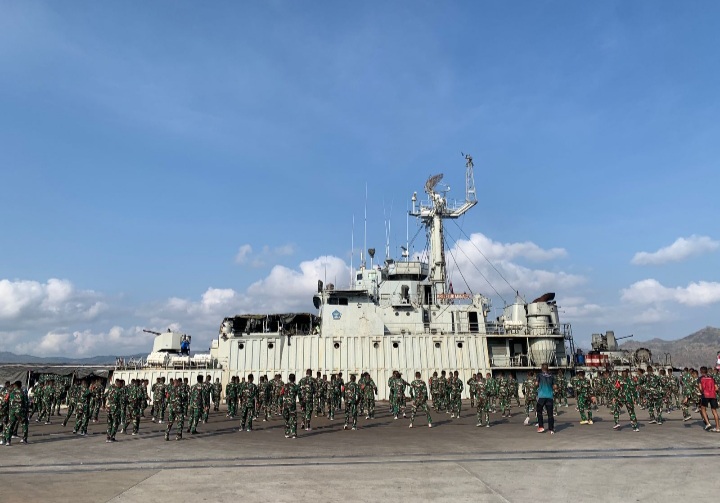 Prajurit Batalyon Kavaleri 6/Naga Karimata yang sedang dalam perjalanan kembali ke Kota Medan singgah di Pelabuhan Gilimas. Selama singgah, para prajurit juga menjaga kebugaran fisik dengan melakukan senam dan tari-tarian tradisional dari Nusa Tenggara Timur.