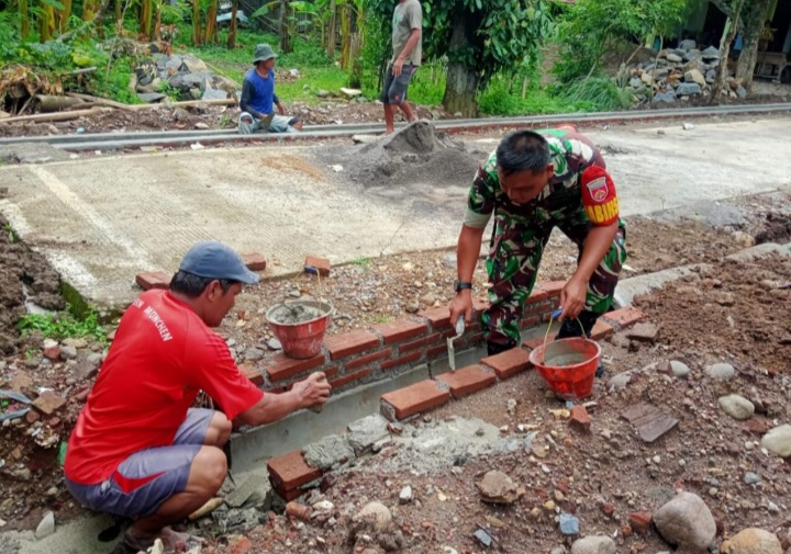 Sragen - Sertu Supodo Babinsa Srimulyo anggota Koramil 06/Gondang Kodim 0725/Sragen bersama warga Dk. Pagah Kidul RT 02 Desa Srimulyo Kec. Gondang bahu-membahu membangun talud jalan desa yang rusak. Kegiatan gotong royong ini dilakukan sebagai bentuk kepedulian TNI terhadap infrastruktur desa dan meningkatkan aksesibilitas bagi warga.