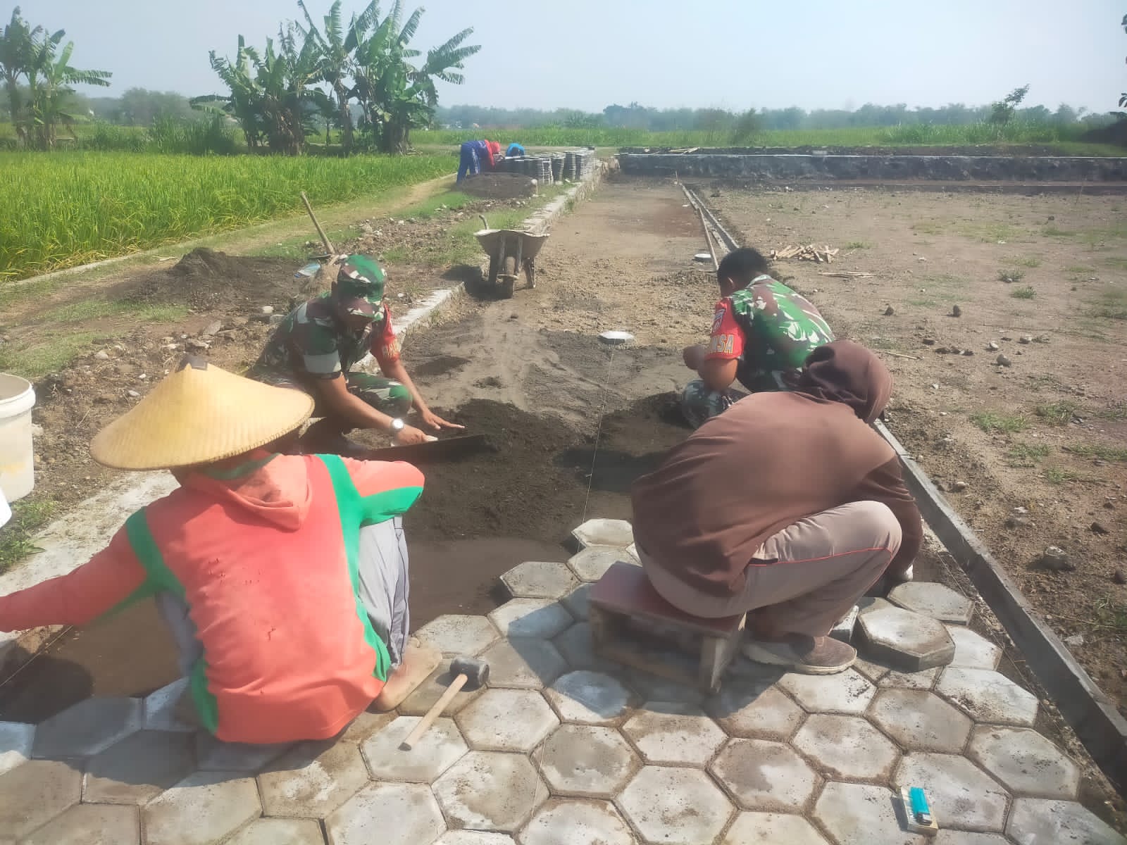 Sragen - Sertu Heriyanto beserta satu orang anggota Koramil 18/Kalijambe Kodim 0725/Sragen kembali menunjukkan kepeduliannya terhadap warga binaannya dengan berpartisipasi dalam kegiatan karya bakti pemasangan paving blok di Dk.Ngumbul DusunTegalombo Kecamatan Kalijambe, Kamis (03/10/2024 ).
