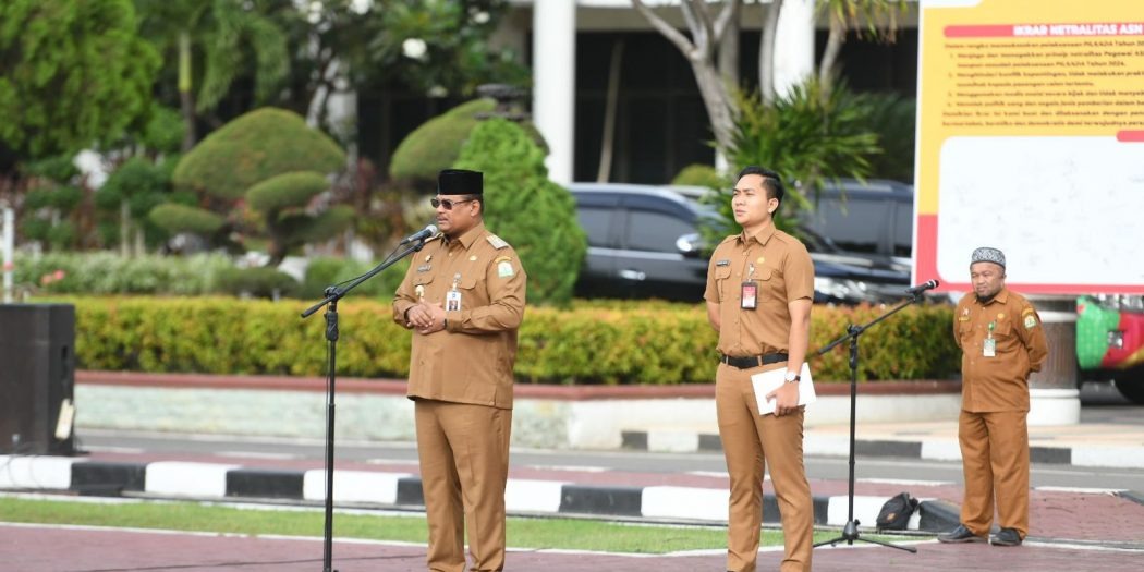 Pj Gubernur Safrizal saat menjadi pembina apel Senin pagi di halaman Kantor Gubernur Aceh, (14/10/2024).