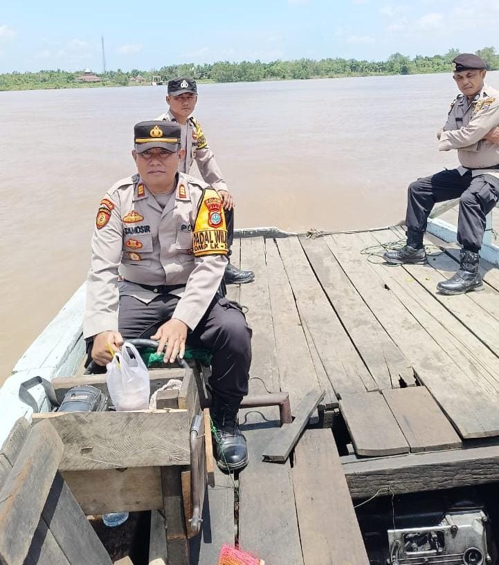 Tempuling, Inhil - Melewati Sungai Indragiri Hilir yang rawan lintasan Satwa liar seperti Buaya di perairan Desa Harapan Jaya Indragiri Hilir, Personil Polsek Tempuling tetap semangat melaksanakan giat Cooling System Pilkada Riau 2024.