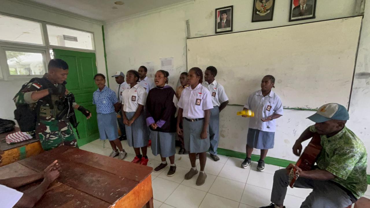 Ilaga - Prajurit Satgas Yonif 323 Buaya Putih melalui Titik Kuat Kotis Ilaga, mengajar musik pada kegiatan Ekstrakulikuler anak-anak SMA B 1 Ilaga, Kampung Kago, Distrik Ilaga, Kabupaten Puncak, Papua Tengah, Rabu (23/10/2024).