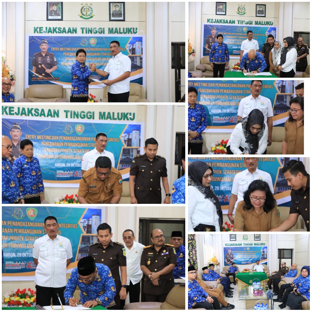 Ambon - Senin 28 Oktober 2028, Pukul 10.00 Wit, Kepala Kejaksaan Tinggi Maluku Agoes Soenanto Prasetyo, S.H.,M.H, memimpin pelaksanaan Penandatangan Pakta Integritas Pendampingan Proyek Strategis (PPS) dan Proyek Strategis Daerah (PSD) dalam kegiatan Entry Meeting yang dilaksanakan oleh Kejaksaan Tinggi Maluku bersama Pemerintah Provinsi Maluku yang diikuti oleh Pj. Gubernur Maluku Ir. Sadali Ie, M.Si dan beberapa Pimpinan OPD lingkup Provinsi Maluku.