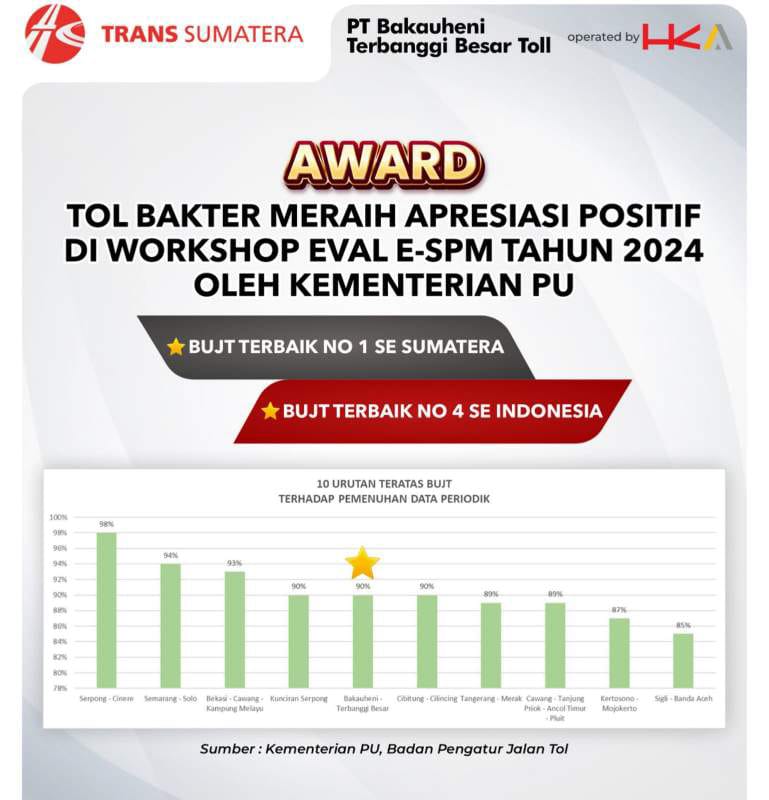 Jakarta - Tol Bakauheni Terbanggi Besar (Bakter) meraih apresiasi positif dalam acara Workshop Monitoring Evaluasi Pemenuhan Self Assessment Aspek SPM Jalan Tol yang dilaksanakan oleh Badan Pengatur Jalan Tol (BPJT) di Hotel Ambhara, Jakarta Selatan, Jumat, 22 November 2024.