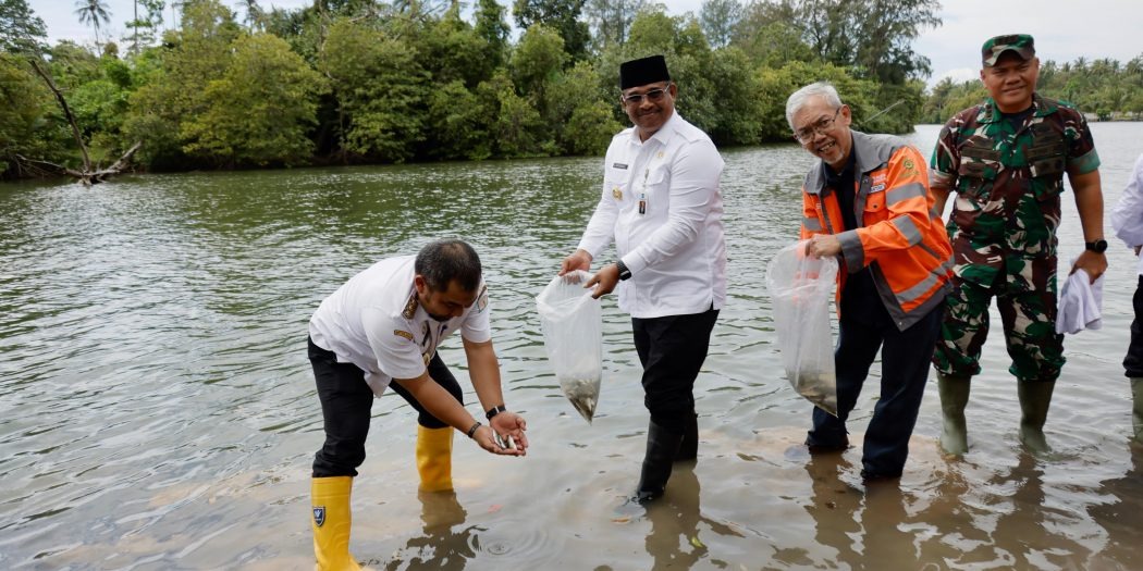 Aceh Besar - Penjabat (Pj) Gubernur Aceh, Dr. H. Safrizal ZA, M.Si, melepas ribuan calon induk ikan kakap putih di Krueng Raba, Quarry Clay PT Solusi Bangun Andalas (SBA), Lhoknga, Aceh Besar, pada Rabu, 18 Desember 2024. Selain pelepasan ikan, turut dilakukan penanaman bibit pohon sebagai bagian dari komitmen menjaga kelestarian lingkungan.