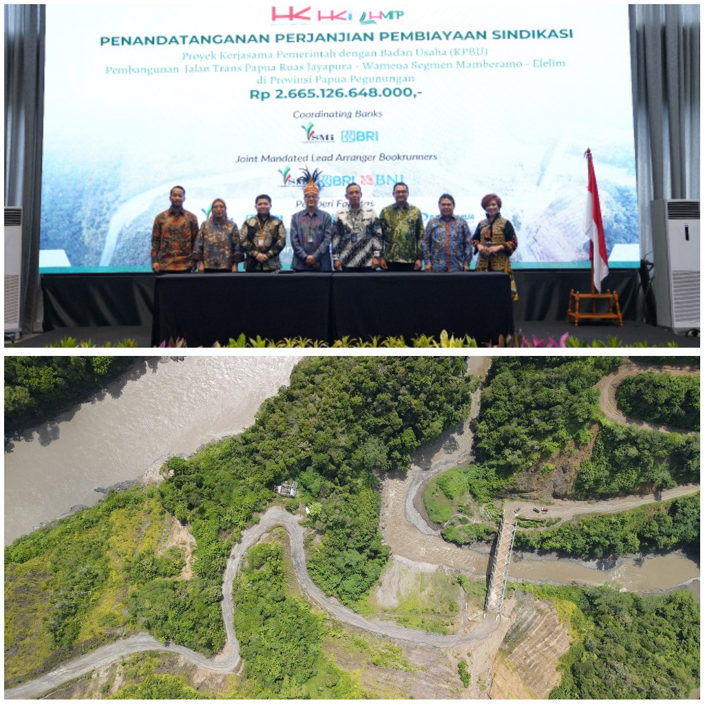 Jakarta - PT Hutama Mambelim Trans Papua (HMTP), Badan Usaha Pelaksana (BUP) yang dibentuk oleh Konsorsium antara PT Hutama Karya (Persero) (Hutama Karya) dan PT Hutama Karya Infrastruktur (HKI) telah menandatangani Perjanjian Pembiayaan Sindikasi Proyek Kerjasama Pemerintah dengan Badan Usaha (KPBU) Pembangunan Jalan Trans Papua Ruas Jayapura -Wamena Segmen Mamberamo-Elelim di Provinsi Pegunungan pada Senin (30/12) di Ballroom Gedung HK Tower, Jakarta.