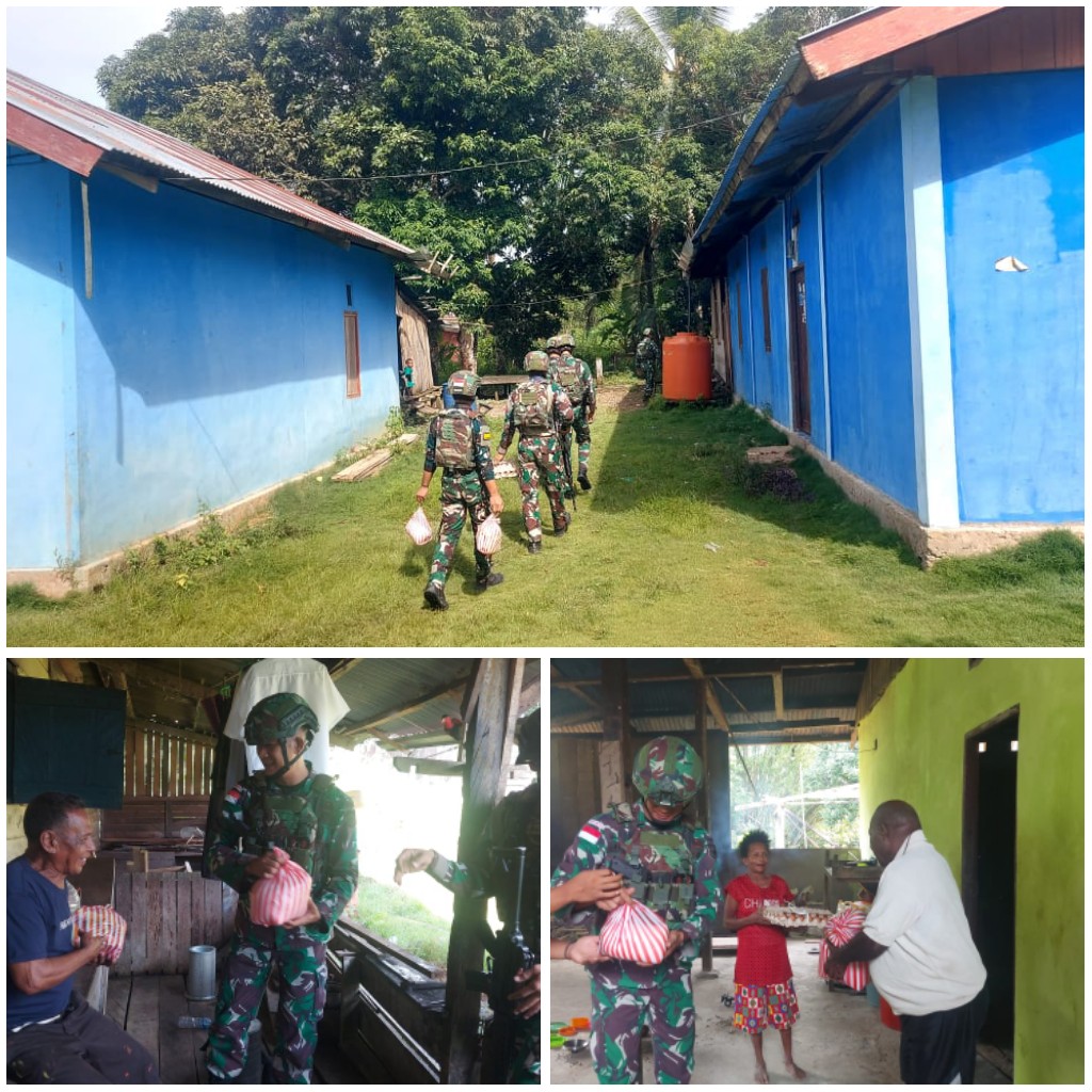 Mansel - Pos Kout Tahota Satgas Pamtas RI-PNG Yonif 642/Kps Wilayah Papua Barat yang dipimpin langsung oleh Danpos Lettu inf Supiyan melaksanakan kegiatan berbagi sembako kepada masyarakat guna membantu masyarakat sekitar distrik Tahota, pada Senin (6/01/2025).