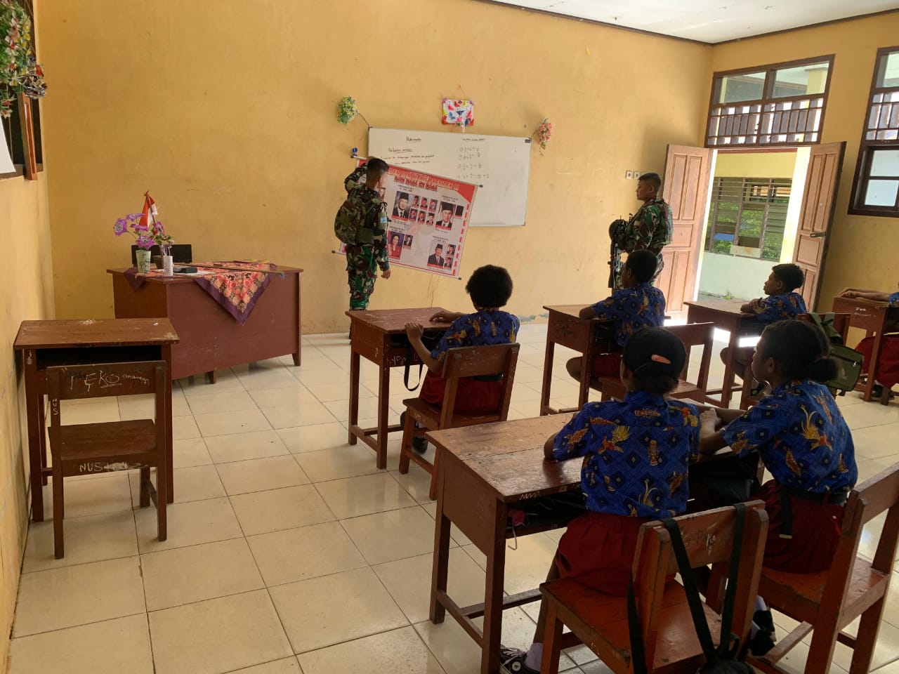 Fak-Fak - Pos Kramamongga Satgas Pamtas RI-PNG Kewilayahan Papua Barat Yonif 642/Kapuas DPP Sertu Oji Kharisma melaksanakan mengajar Wawasan kewarganegaraan kepada murid SD Impres Krawargef Distrik Kramamongga Kabupaten Fak-Fak, Provinsi Papua Barat, pada Kamis (23/1/2025)