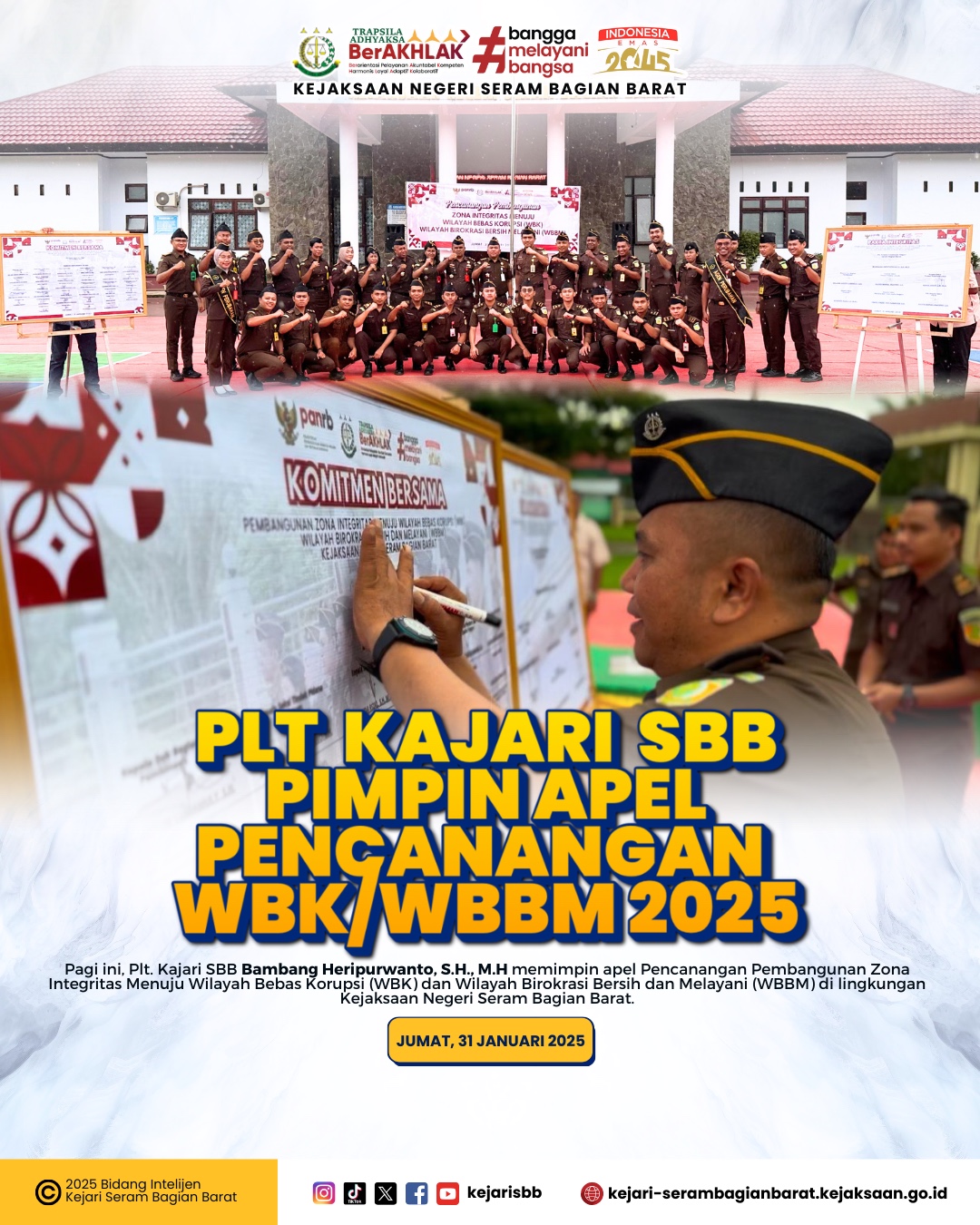 Seram Bagian Barat - Plt Kajari Seram Bagian Barat Bambang Heripurwanto, S.H., M.H memimpin apel Pencanangan Pembangunan Zona Integritas Menuju Wilayah Bebas Korupsi (WBK) dan Wilayah Birokrasi Bersih dan Melayani (WBBM) di lingkungan Kejaksaan Negeri Seram Bagian Barat, pada Jumat (25/1/2025).