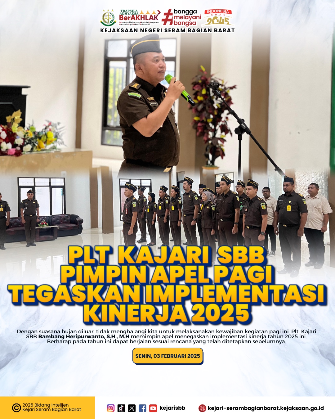 Seram Bagian Barat - Plt Kepala Kejaksaan Negeri Seram Bagian Barat Bambang Heripurwanto, S.H., M.H memimpin apel Senin pagi diawal bulan ini diikuti oleh para Kasi/kasubagbin, para Kasubsi/kaur, para Jaksa Fungsional dan seluruh Staff Kejaksaan Negeri Seram Bagian Barat, Senin, 03 Februari 2025.