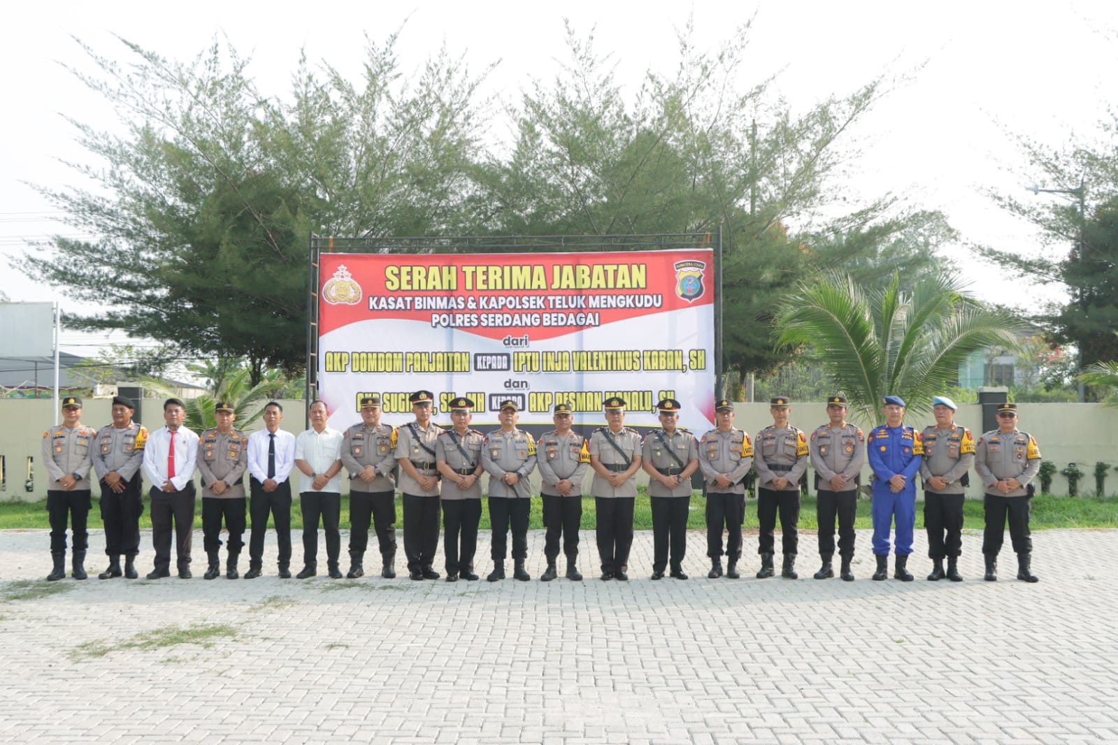 Sergai - Kapolres Serdang Bedagai (Sergai) AKBP Jhon Jhon Hery Rakutta Sitepu, SIK., MH pimpin upacara serah terima jabatan Kasat Binmas dan Kapolsek Teluk Mengkudu di Lapangan Apel Mako Polres Sergai, Selasa (04/02/2025).