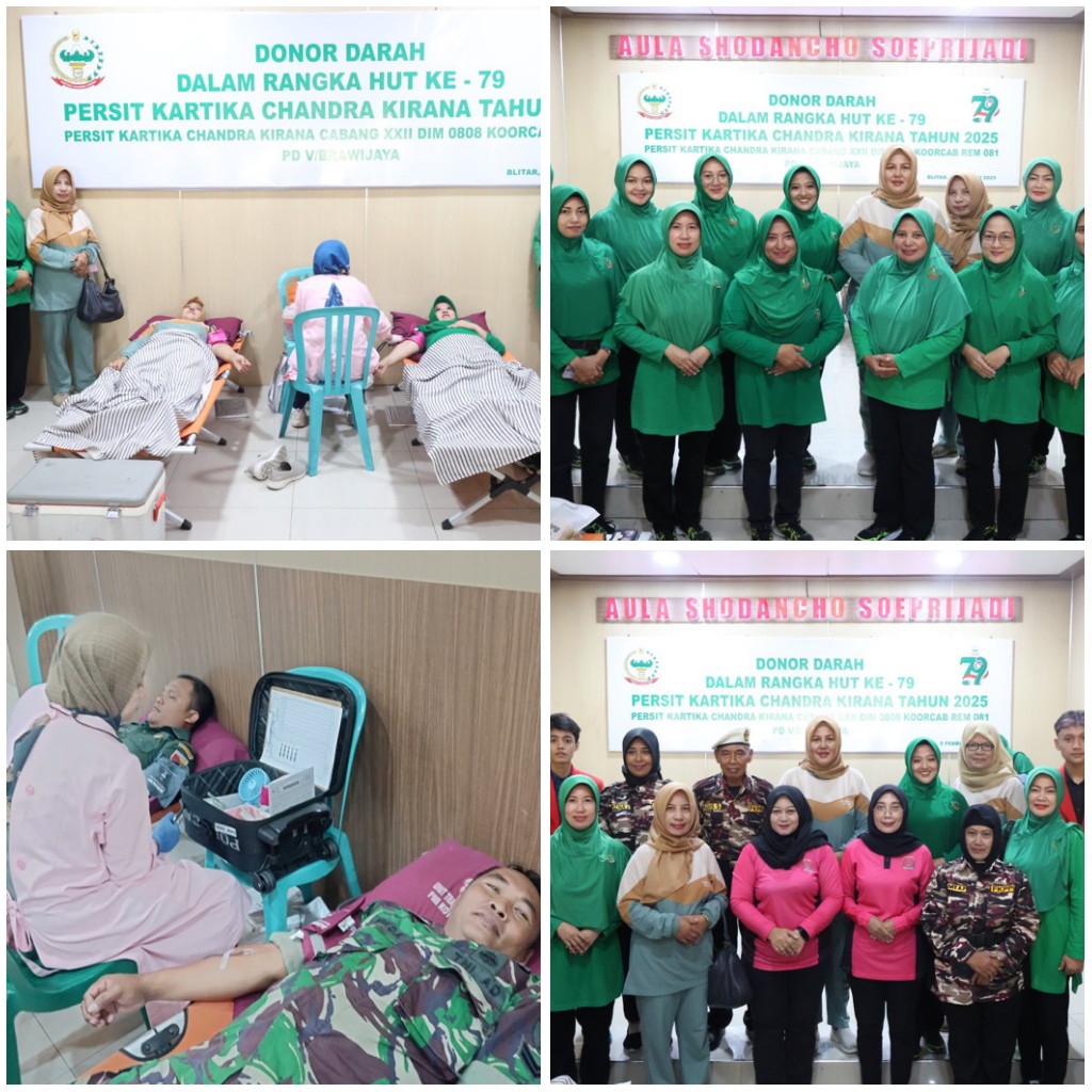 Blitar - Memperingati Hari Ulang Tahun ke-79 Persit Kartika Chandra Kirana (KCK) tahun 2025, Kodim 0808/Blitar berkolaborasi dengan Polkes 05.09.03 Blitar dan PMI Kab/Kota Blitar mengadakan kegiatan bakti sosial donor darah. Acara tersebut berlangsung di Aula Shodancho Soeprijadi Kodim 0808/Blitar Jalan A. Yani No. 06 Kelurahan/Kecamatan Kepanjenkidul Kota Blitar, Rabu (5/2/2025).