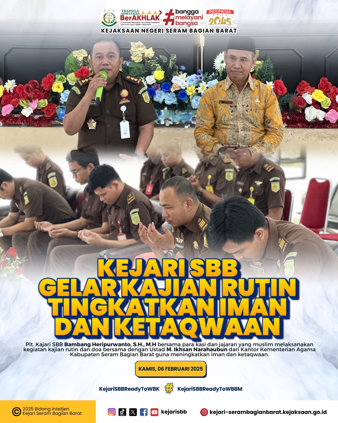 Tingkatkan Iman dan Ketaqwaan, Kejari SBB Gelar Kajian Rutin dan Doa Bersama Kamis, 06/02/2025 | 18:20