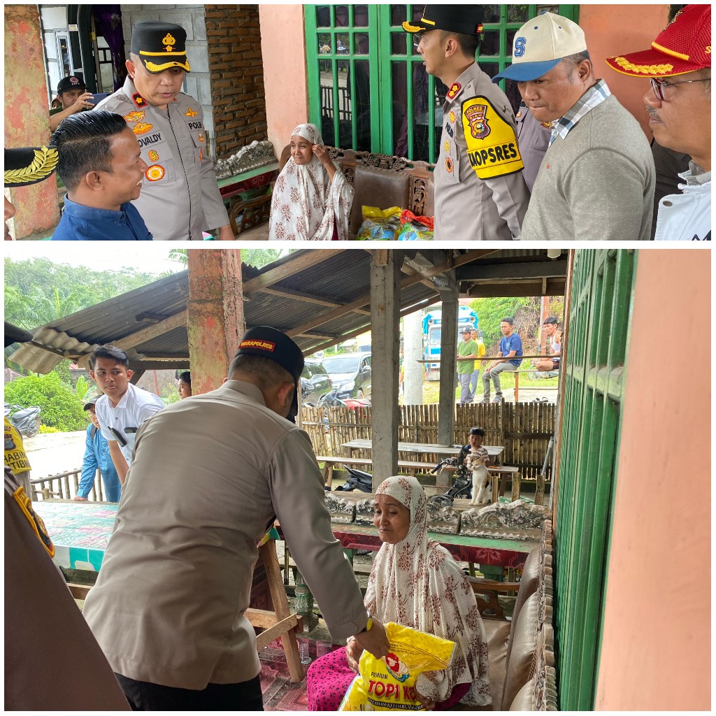 Setelah melakukan peninjauan, Kapolres Kuansing dan rombongan melanjutkan kegiatan dengan mengunjungi rumah warga terdampak longsor akibat meluapnya sungai. Salah satu warga yang menerima bantuan sembako adalah Hasni (62), yang rumahnya terdampak langsung oleh bencana tersebut.