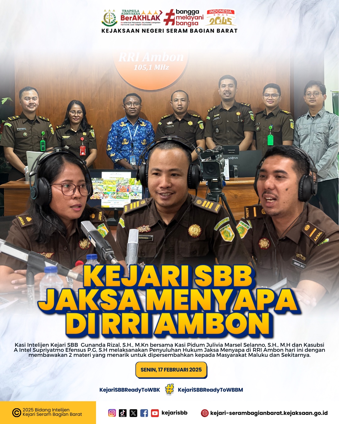 Seram Bagian Barat - Plt Kejari Seram Bagian Barat (SBB) Bambang Heripurwanto S.H.,M H yang wakilkan Kasi Intel Kejari SBB Gunanda Rizal, S.H., M.Kn bersama narasumber lainnya yaitu Kasi Pidum Julivia Marsel Selanno, S.H., M.H dan Kasubsi A Intel Supriyatmo Efensus P.G, S.H serta staff intelijen lainnya melaksanakan penyuluhan hukum "Jaksa Menyapa" pada hari ini di Kantor Radio Republik Indonesia (RRI) Kota Ambon, pada Senin (17/2/2025).