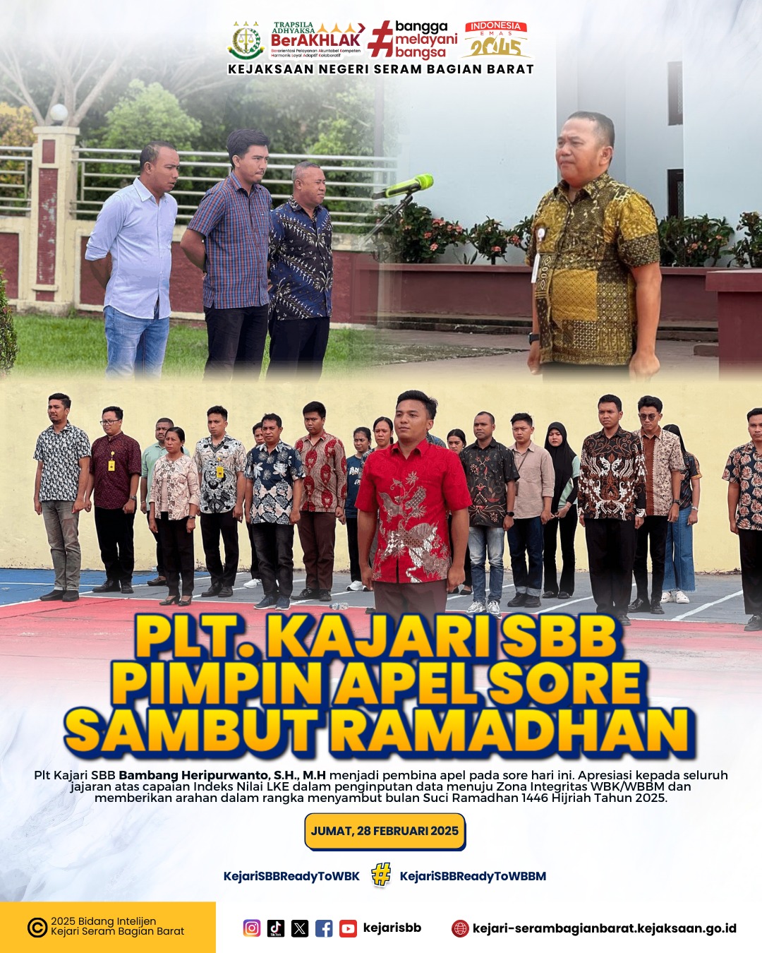 Seram Bagian Barat - Plt Kajari SBB Bambang Heripurwanto, S.H., M.H memimpin apel sore, acara ini diikuti oleh para kasi dan jajaran. Dalam apel ini, beliau berikan apresiasi diberikan kepada seluruh pegawai atas kinerja dalam rangka mendapatkan predikat WBK/WBBM dengan nilai LKE 101,3% dan menegaskan kembali arahan Jaksa Agung dalam kunjungan kerja virtual siang tadi, pada Jumat, 28 Februari 2025.