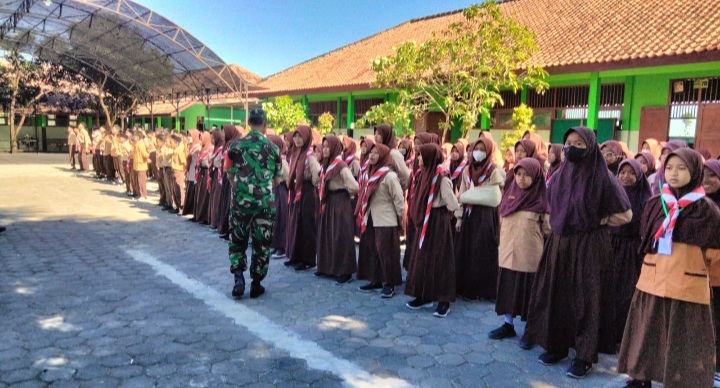 Sragen - Babinsa Desa Girimargo Koramil 16/Miri Dim 0725/Sragen Sertu Adi bersama Guru MTs 7 melaksanakan Kegiatan Binwanwil kepada Siswa MTs 7 Sragen dalam rangka pembelajaran Ekstra Kurikuler Kepramukaan.