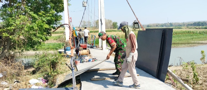 Boyolali - Babinsa Koramil 18/Kemusu Kodim 0724/Boyolali Serma Paimin bersama masyarakat melaksakan gotong royong perbaikan jembatan gantung di desa Klewor Kecamatan Kemusu Kabupaten Boyolali, Rabu (13/09/23).