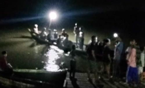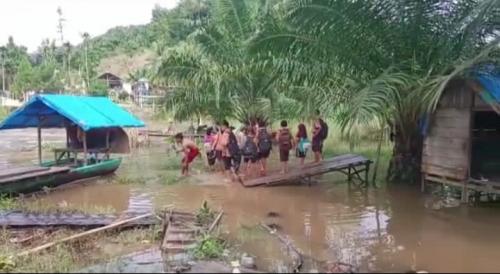 Tampak anak-anak sekolah dusun Lubuk Sihim arah barat dari Desa Muara Batang Angkola naik pompong untuk sekolah.