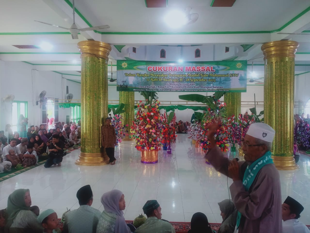 Ketua Masjid Rosyidi Mansyur mengatakan, peringatan Maulid Nabi Muhammad SAW 1445 Hijriyah digelar yakni berupa cukur rambut massal untuk bayi ini menurutnya, merupakan tradisi turun temurun masyarakat Melayu Bangka Kota memang diperuntukkan bagi para balita yang belum cukur rambut.