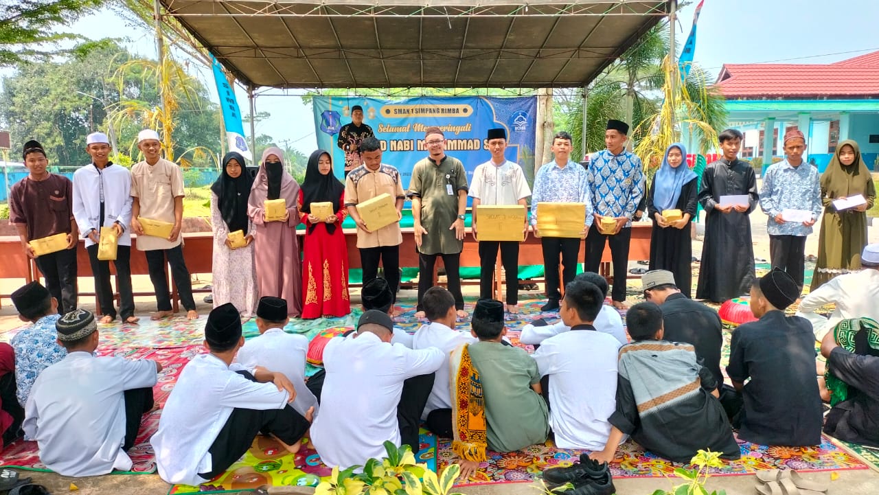 Di SMA Negeri 1 Simpang Rimba kami melaksanakan pada kegiatan tersebut. Kegiatan Maulid tahun ini diselenggarakan oleh pengurus Rohis, anggota osis dan kepramukaan SMAN 1 SIMBA dengan Tema “Meneladani Akhlak Nabi Muhammad SAW untuk Membangun Karakter Generasi Muda yang Religius” dengan dihadiri oleh seluruh warga sekolah.