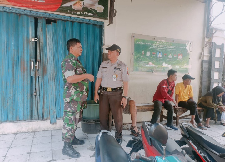Surakarta - Babinsa Kelurahan Danukusuman Koramil 03/Serengan Kodim 0735/Surakarta Sertu Rochani melaksanakan Komsos dengan Bapak Dwi Ariadi (Satpam) di Pasar Harjodaksino Jln. Yos Sudarso no. 34 Danukusuman Serengan Kota Surakarta, (7/10/23).