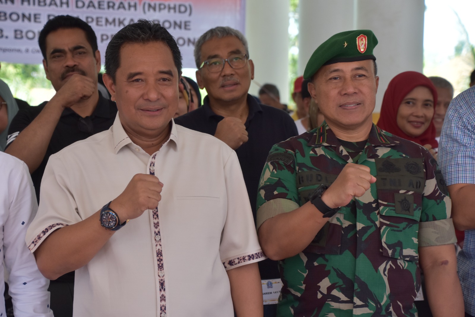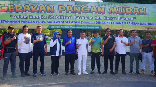 Watampone – Danrem 141/Tp Brigjen TNI Budi Suharto, S.I.P., M.Si. dampingi Pj. Gubernur Sulawesi Selatan Dr. Bahtiar Baharuddin, M.Si. bersama Pj. Bupati Bone Drs. H. A. Islamuddin, M.H. dan unsur Forkopimda lainnya mengikuti Jalan Sehat dan Gerakan Pangan Murah dirangkaikan Penandatanganan Naskah Perjanjian Hibah Daerah (NPHD) di Lapangan Merdeka Kabupaten Bone, Minggu (08/10/2023).