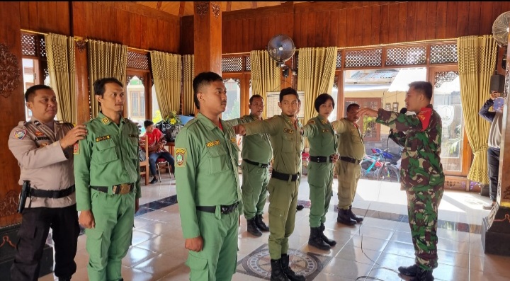Surakarta - Babinsa Kelurahan Tipes Serka Sarmin dan Serka Anjasmoro Koramil 03 Serengan Kodim 0735/Surakarta bersama Bhabinkatibmas memberikan pelatihan Linmas, di Pendopo Tipes, di Jalan Cokrobaskoro 03, no.13 R2 01/ 05 Tipes Serengan Kota Surakarta, Senen (09/10/2023).