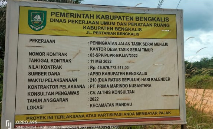 Bengkalis - Proyek peningkatan jalan Tasik Serai menuju kantor Desa Tasik Serai Timur senilai Rp 46,596 miliar, yang bersumber dari APBD Bengkalis Tahun 2022 diduga korupsi. Hal itu tertera dalam di Laporan Hasil Pemeriksaan (LHP) Badan Pemeriksaan Keuangan (BPK) RI Tahun 2022.