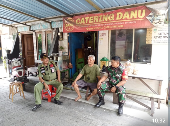 Surakarta - Babinsa Kelurahan Danukusuman Koramil 03 Serengan Kodim 0735 Surakarta Sertu Rochani melaksanakan melaksanakan kegiatan Pembinaat Teritorial dengan cara Komunikasi Sosial (Komsos) dengan Bapak Mulyadi (ketua Rt 02 RW 07) Danukusuman Serengan Kota Surakarta, (14/10/2023).