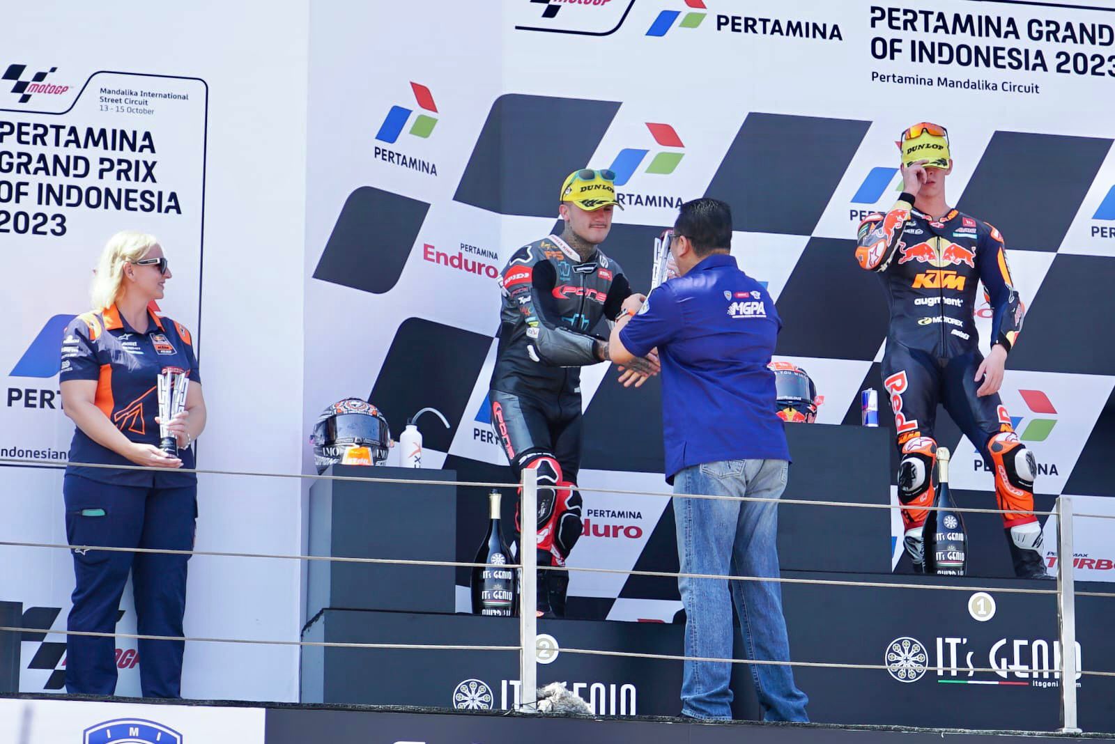 Juara I MotoGP Pertamina Grand Prix of Indonesia 2023 dimenangkan Francesco Bagnaia. Disusul Maverick Vinales di posisi kedua, serta Fabio Quartararo di posisi ketiga.