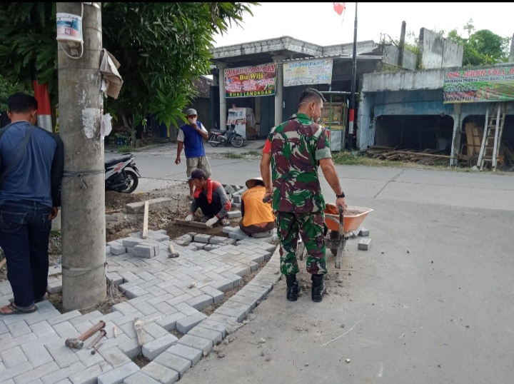 Sebagai aparat wilayah, Babinsa harus selalu ikut terjun langsung ke lapangan bersama warga untuk gotong-royong pemasangan paving block ini.