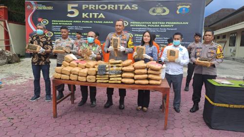 Madina - Polres Mandailing Natal (Madina) memusnahkan puluhan ball daun ganja kering siap edar hasil tangkapan selama sebulan operasi oleh Satnarkoba.