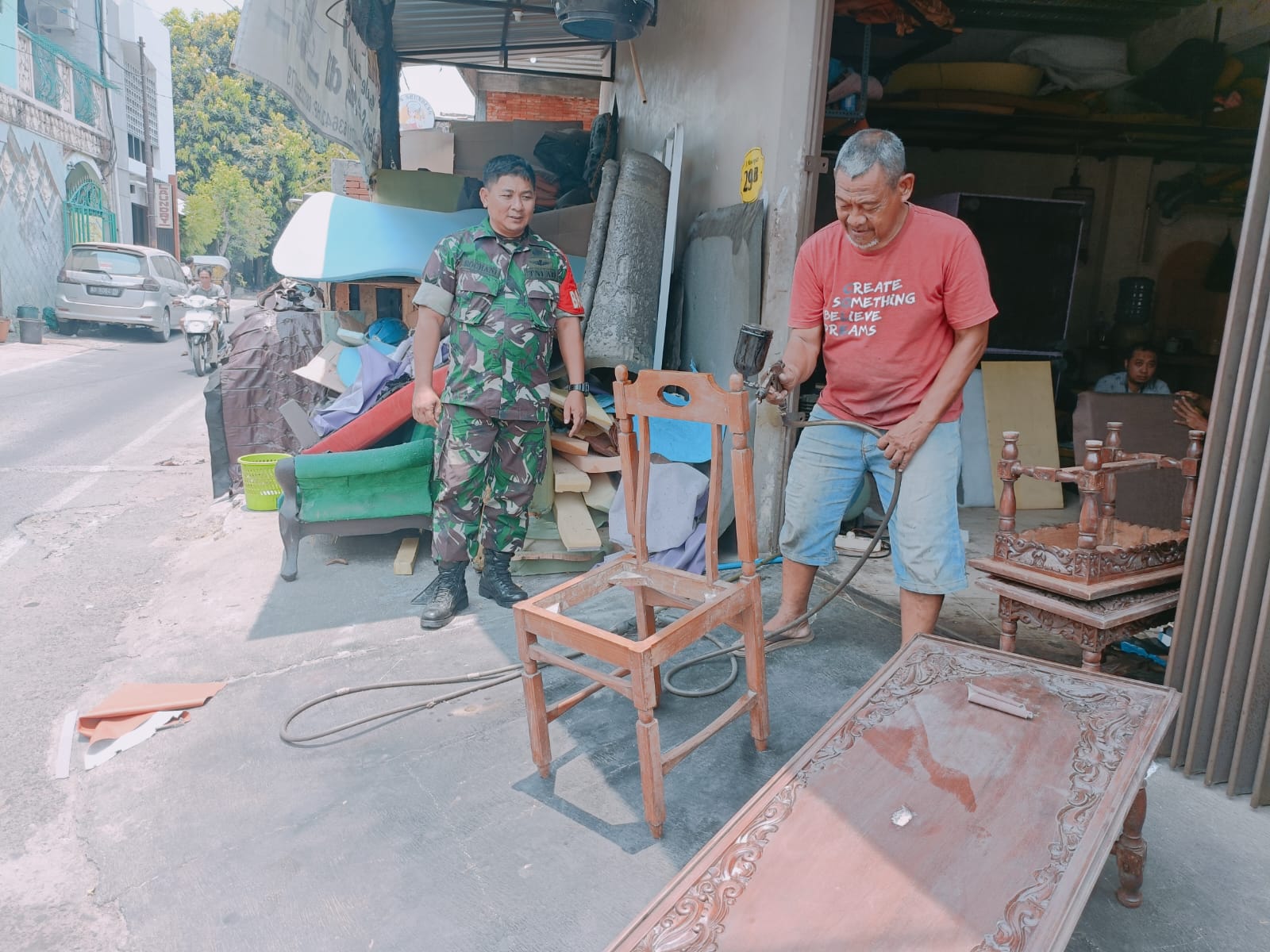Surakarta - Bintara pembina desa (Babinsa) Kelurahan Danukusuman Koramil 03/Serengan Kodim 0735/Surakarta Sertu Rochani bersama Linmas pada pukul 08.00 wib hingga selesai melaksanakan kegiatan Komsos dengan para pelaku UMKM (Usaha Mikro, Kecil dan Menengah) Milik Ibu Tatik Yang bergerak dalam usaha Furniture di Jl. Mayangsari No 29B Rt.02/Rw.13 Danukusuman Serengan Kota Surakarta, (28 Oktober 2023).