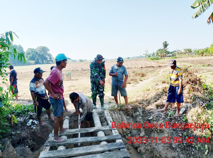 Gowa - Serda Ilyas Babinsa Desa Bungaejaya Koramil 1409-05/Pallangga Kodim 1409/Gowa bersama masyarakat melaksanakan gotong royong memperbaiki jembatan yang rusak yang bertempat di Dusun Raja-raja Desa Bungaejaya, Kecamatan Pallangga, Kabupaten Gowa, Minggu (05/11/2023).