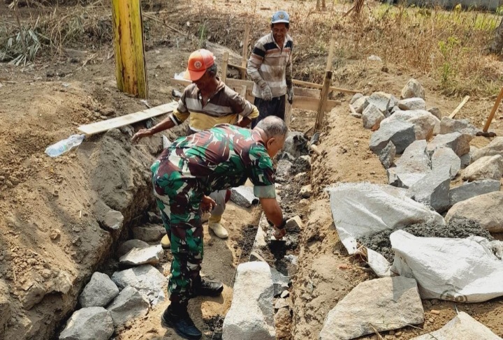 Boyolali - Guna mewujudkan Kemanunggalan TNI dan rakyat, Babinsa Koramil 03/Mojosongo Kodim 0724/Boyolali Serka Agus Margono melaksanakan karya bakti pembangunan talud bersama masyarakat di Desa Madu Kecamatan Mojosongo Kabupaten Boyolali, Senin (06/10/2023)