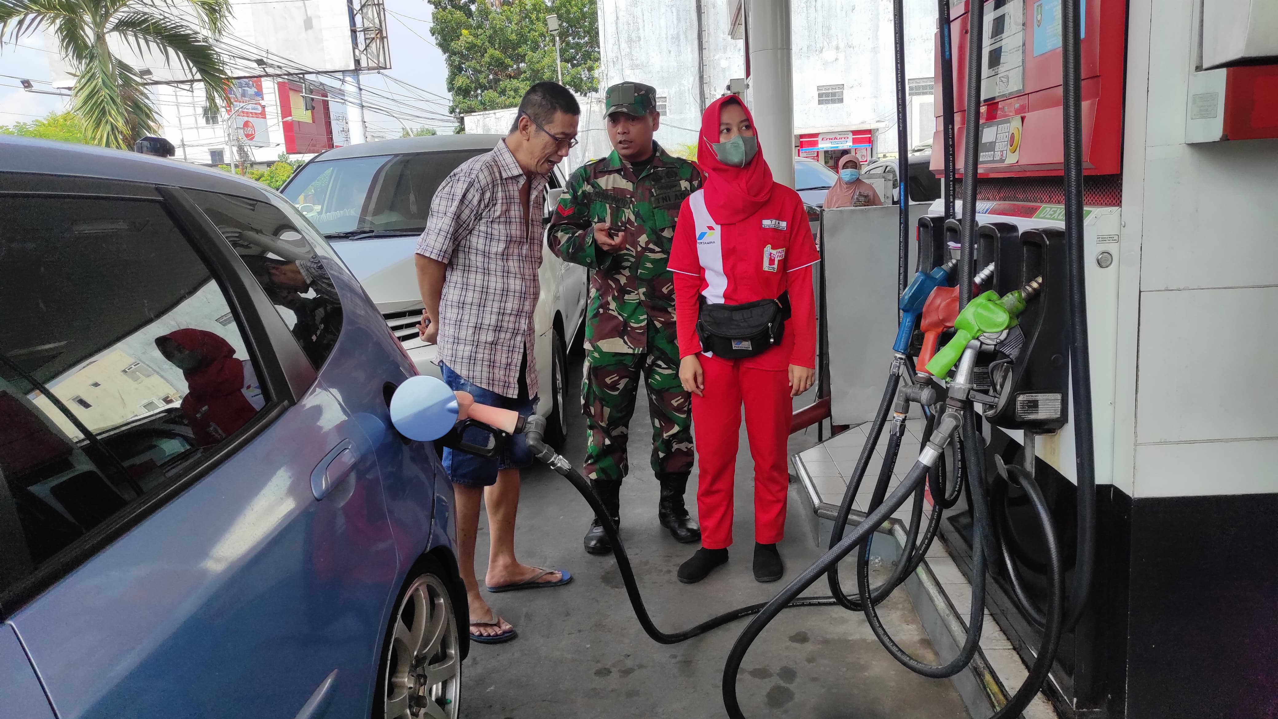 Surakarta - Personel Bintara Pembina Desa (Babinsa) Kelurahan Kratonan Koramil 03/Serengan Kodim 0735/Surakarta Sertu Suwarno dan Koptu Resbiyanto pada pukul 08.00 WIB turun kewilayah binaan untuk melaksanakan kegiatan Komunikasi Sosial (Komsos) bersama dengan karyawan SPBU dan masyarakat wilayah binaan pada pelaksanaan kegiatan pemantauan antrian pembelian bahan bakar minyak di wilayah Koramil 03/serengan bersama dengan Deni dan Tia (Karyawan SPBU) serta Rudi (Masyarakat) kegiatan tersebut yang dilaksanakan bertempat SPBU Serengan Jl. Veteran Kratonan Serengan Kota Surakarta, Minggu (12/11/2023).
